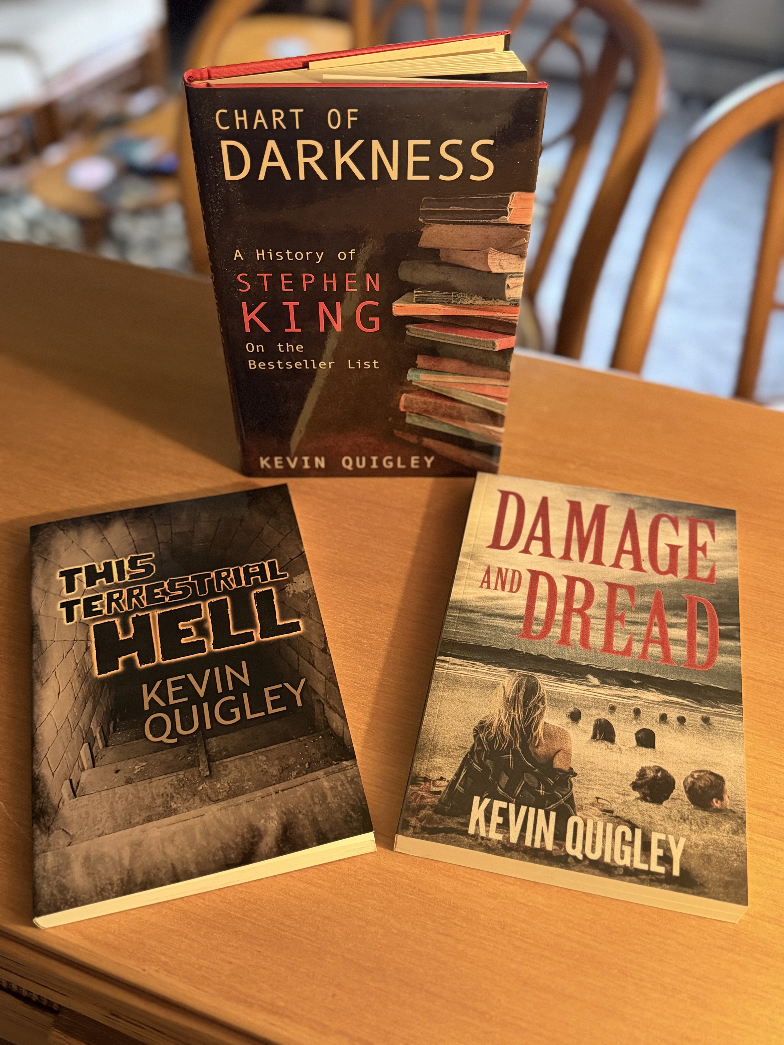 While A Good Story & Good Words sold out very quickly, I still have a (very) few copies of Chart of Darkness: A History of Stephen King on the Bestseller List ($40 + shipping), and my story collections - This Terrestrial Hell ($14 + shipping) and Damage & Dread ($16 + shipping), both out of print! Email me at KevinQuigleyDesign@gmail.com to inquire!
